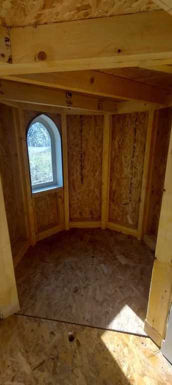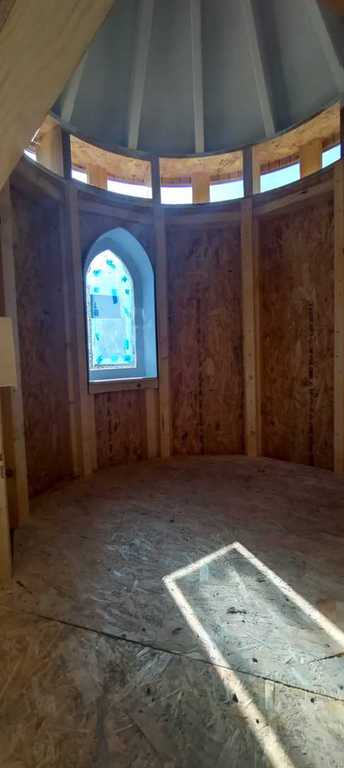 Maximum footprint 4.4m x 2.7m; internal turret diameter 1.1m, wall height 2.4m + void up into turret 3m+; main body internally 2.8x1.8m. Wall height 1.8m/to ridge 2.7m.